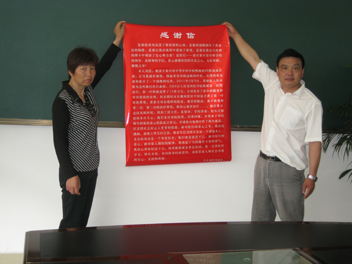 刘浩同学在今年3月份发现身患急性淋巴性白血病后,全校师生积极行动起来,人人伸出了扶危济困之手,在校园内唱响了一曲爱的奉献大合唱,全校师生共为刘浩同学捐款两万多元,并帮助他联系市慈善总会和保险公司,为刘浩同学战胜病魔提供了精神氛围。